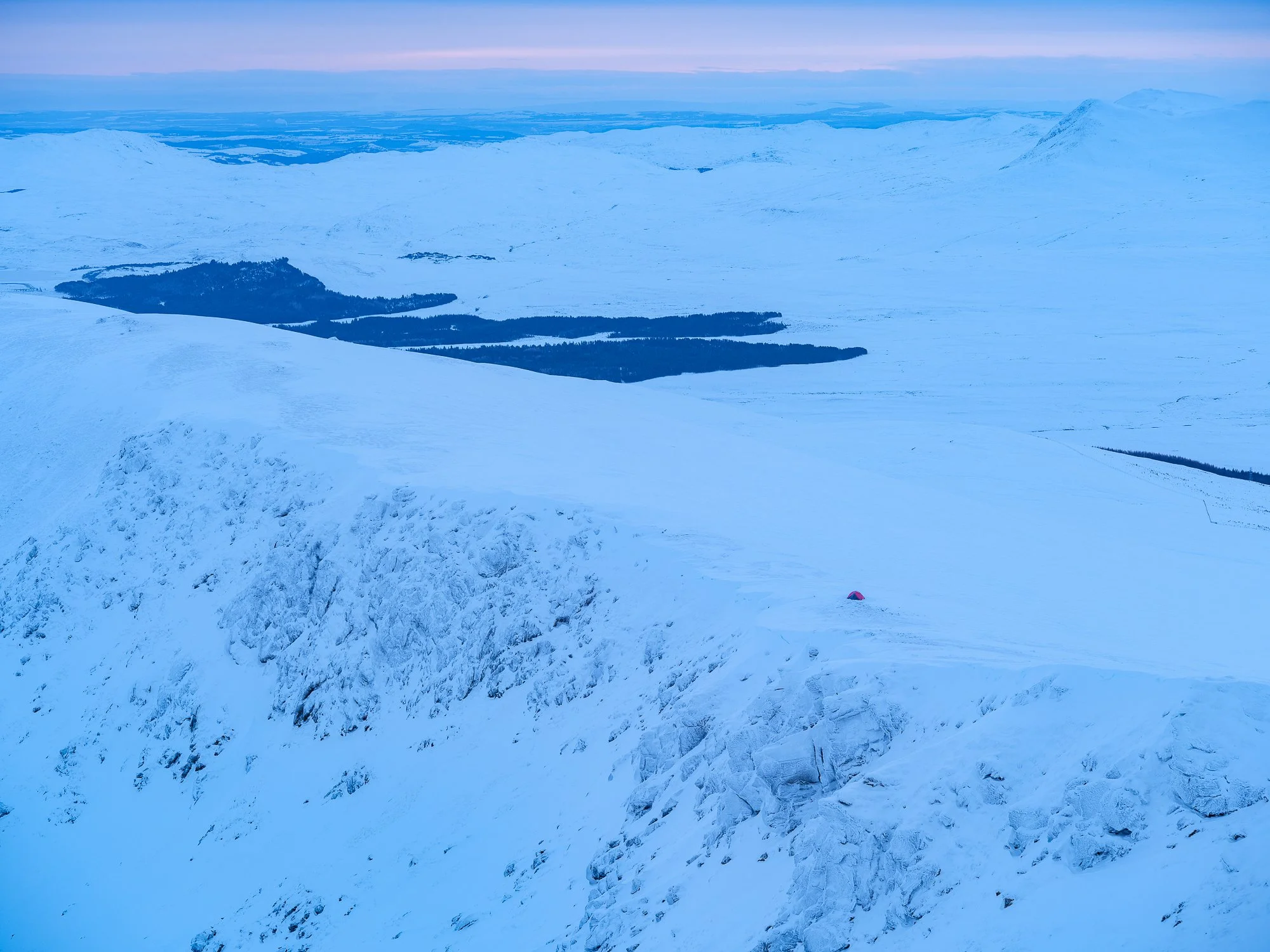 Suddenly I was there at the proposed camp, I could of cried but I was too dry. First order of business was to get the tent up, the ground frozen and rocky. I scoured around and eventually found a flat patch of snow, that would have to do, luckily there was little wind, the guy lines more for show than anything else. It should take five to six hours up and down in the summer, it had taken me six hours just to get up and this wasn’t the summit just the bealach between the summit and another small hill; the summit would keep until the morning. Food and a large hot mug of tea were the order now. Wow did that tea taste good.