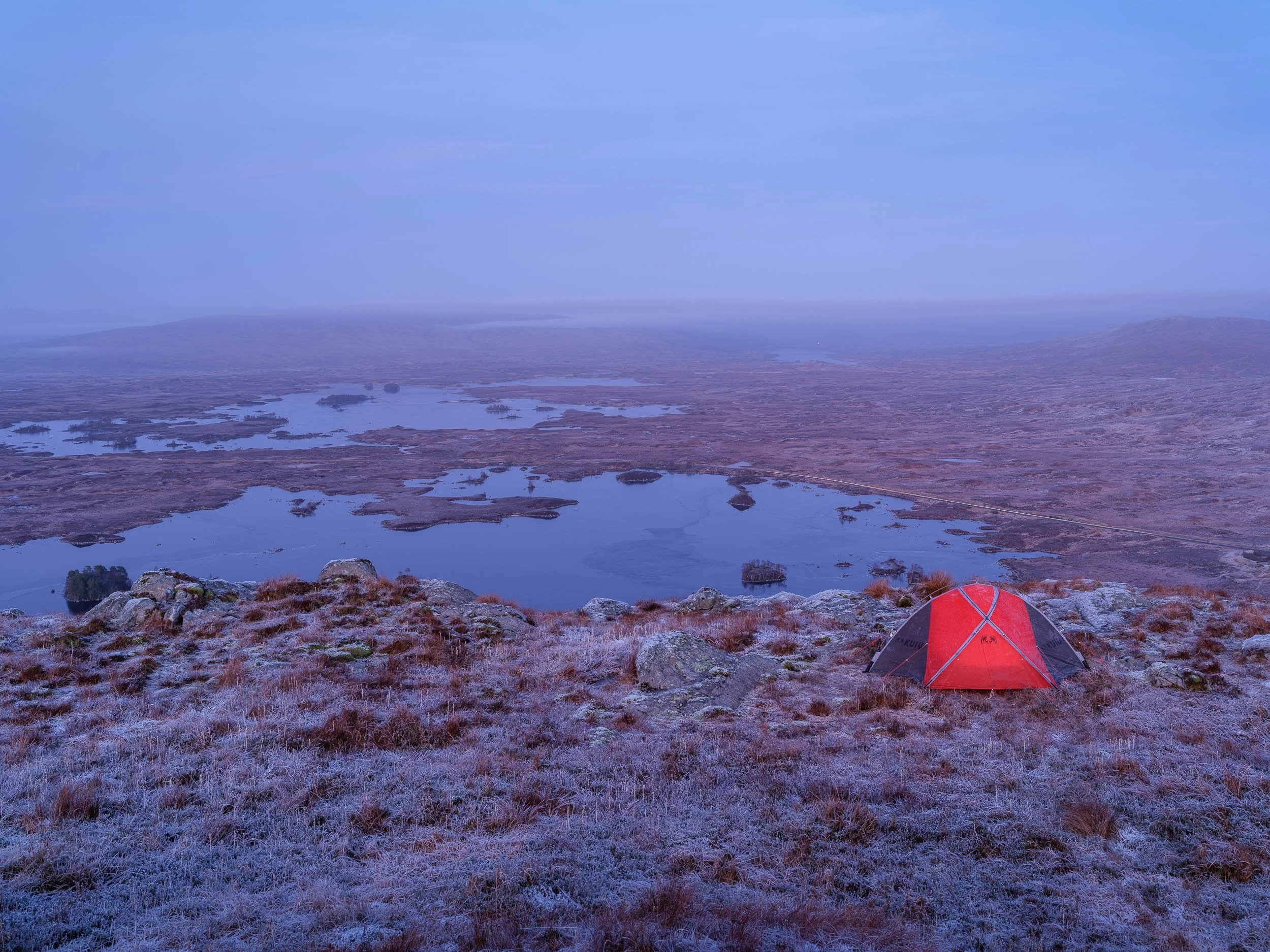 After scouting around and of course returning to a previously spied spot I set about setting up, with some difficulty. The ground was frozen solid and at first I thought I wouldn’t get a peg in, but putting my knee behind it, much to a complaining hand one then another went in, secure. It was a blessing and a curse, getting the pegs in was a challenge but it would have been too boggy a spot if it were not frozen. I always peg out, you never know if the wind might pick up in the night.